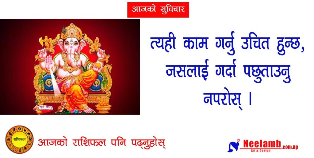 आजको राशिफल बि.सं. २०८० साउन ३० गते मङ्गलबार ई.सं.२०२३ अगस्त १५ नेपाल सम्बत ११४३ अनालागा चतुर्दशी, पिङ्गल नाम संवत्सर, सूर्य दक्षिणायणं ग्रीष्म ऋतु, अधिक श्रावण कृष्ण चतुर्दशी, चन्द्रमा कर्कट राशिमा, पुष्य नक्षत्र, व्यतिपात योग, शकुनि करण । आज नेपालमा सूर्योदय बिहान ५: ३४ बजे, सूर्यास्त साँझ ६: ४२ बजे हुनेछ । आज जन्म लिने बच्चा […]