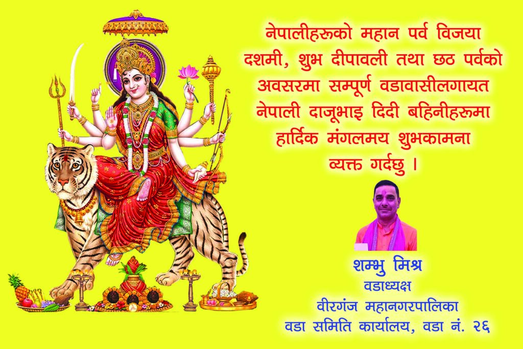 वीरगंज, १० कात्तिक । वीरगंज महानगर–१३ मुर्लीस्थित बौधीमाई मन्दिरमा मेला सम्पन्न भएको छ । बौधीमाईको डोला र कलश यात्रा निकालेर भक्तजनहरुले हरिहरनाथ मन्दिर, सातोमाई मन्दिर, ब्रह्म बाबाको पूजा गरेका थिए । यसपटक मेला भव्यताका साथ लगाइएको थियो । बौधीमाई मन्दिरमा भाकल पूरा हुने गरेकोले भक्तजनहरुको मेलामा उल्लेख्य सहभागिता हुने गरेको छ । मेलामा मनोरञ्जनका सामग्री, […]