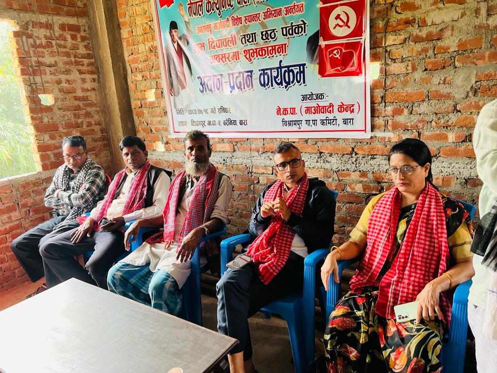 वीरगंज, २० कात्तिक । नेकपा माओबादी केन्द्र बिश्रामपुर गापा कमिटीको आयोजनामा जनतासँग माओबादी बिशेष रूपान्तरण अभियान अन्तर्गत दीपावली तथा छठ पर्बको शुभकामना आदान–प्रदान कार्यक्रम सम्पन्न भएको छ । लवकुश बैठाको अध्यक्षतामा भएको कार्यक्रममा प्रमुख अतिथि जितपुर सिमरा उपमहानगरपालिकाव प्रमुख मेयर राजन पौडेल, विशिष्ट अतिथि पुर्ब महिला आयोग प्रमुख र प्रतिनिधि सभा सदस्य शेख चान्दतारा, अतिथिहरुमा […]