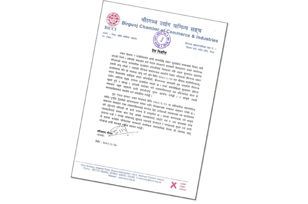 वीरगंज, २८ असोज । वीरगंज उद्योग वाणिज्य संघले मंगलवार प्रेस विज्ञप्ति जारी गर्दै भंसार मूल्यांकन डाटावेस प्रणालीको स्वागत गरेको छ । भंसार विभाग र निजी क्षेत्रसँग लामो समयदेखि भंसार मूल्यांकन सम्बन्धमा विवाद रहदै आएको र यसलाई समाधान गर्न नेपाल सरकारले हालसालै विराटनगर भंसार कार्यालमा परिक्षणको रूपमा पारम्पारिक मूल्यांकन प्रणालीलाई विस्थापन गरी भंसार मूल्यांकन डाटावेस प्रणाली […]