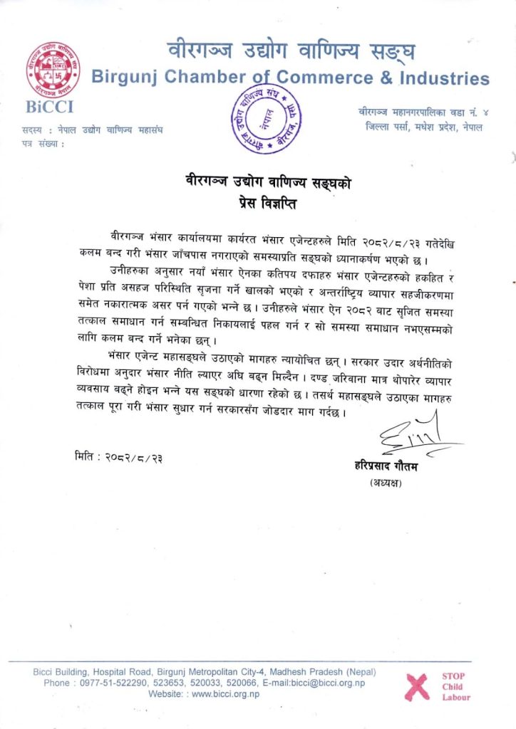 वीरगंज २३ मंसिर । वीरगंज भंसार कार्यालयमा कार्यरत भंसार एजेन्टहरूले मिति २०८२।८।२३ गतेदेखि कलम बन्द गरी भंसार जाँचपास नगराएको समस्याप्रति वीरगंज उद्योग वाणिज्य संघको ध्यानाकर्षण भएको जनाएको छ । उनीहरूका अनुसार नयाँ भसार ऐनका कतिपय दफाहरू भन्सार एजेन्टहरूको हकहित र पेशाप्रति असहज परिस्थिति सृजना गर्ने खालको भएको र अन्तर्राष्ट्रिय व्यापार सहजीकरणमा समेत नकारात्मक असर पर्न […]