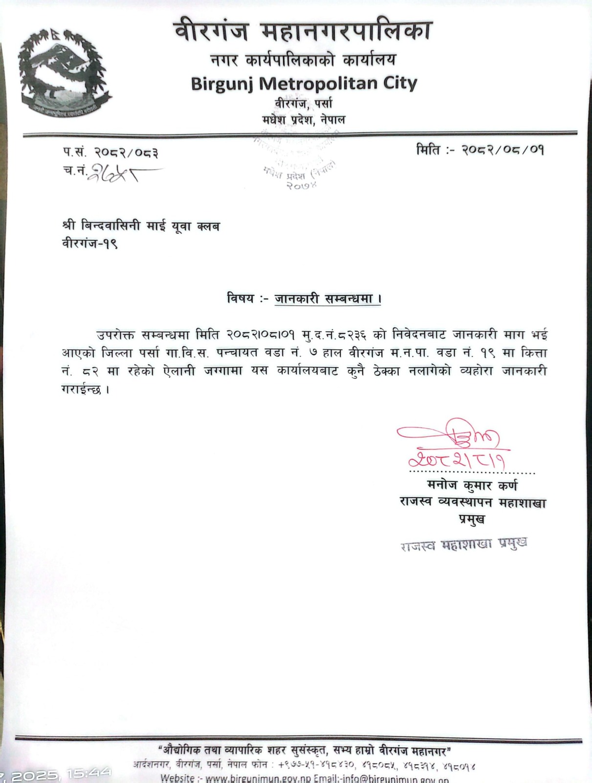 श्री बिन्दबासिनी माई युवा क्लबका अध्यक्ष सोनु कुमार गुप्ताले सार्वजनिक सम्पत्तिमा व्यक्तिहरूले अवैध कब्जा जमाउँदै निजी व्यवसाय सञ्चालन गरेको आरोप लगाउँदै आपत्ति जनाएका छन् । उनले सार्वजनिक जग्गा कब्जा रोक्न महानगरलाई तत्काल कदम चाल्न आग्रह गरेका छन् ।
