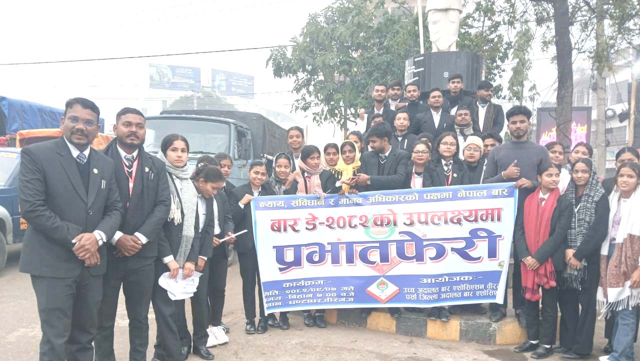 उच्च अदालत बार एसोसिएसन वीरगंज तथा पर्सा जिल्ला अदालत वार एसोसिएसनको संयुक्त आयोजनामा प्रभातफेरी वीरगंज बजार परिक्रमा गर्दै पुनः घण्टाघरमै पुगेर सम्पन्न भएको थियो ।