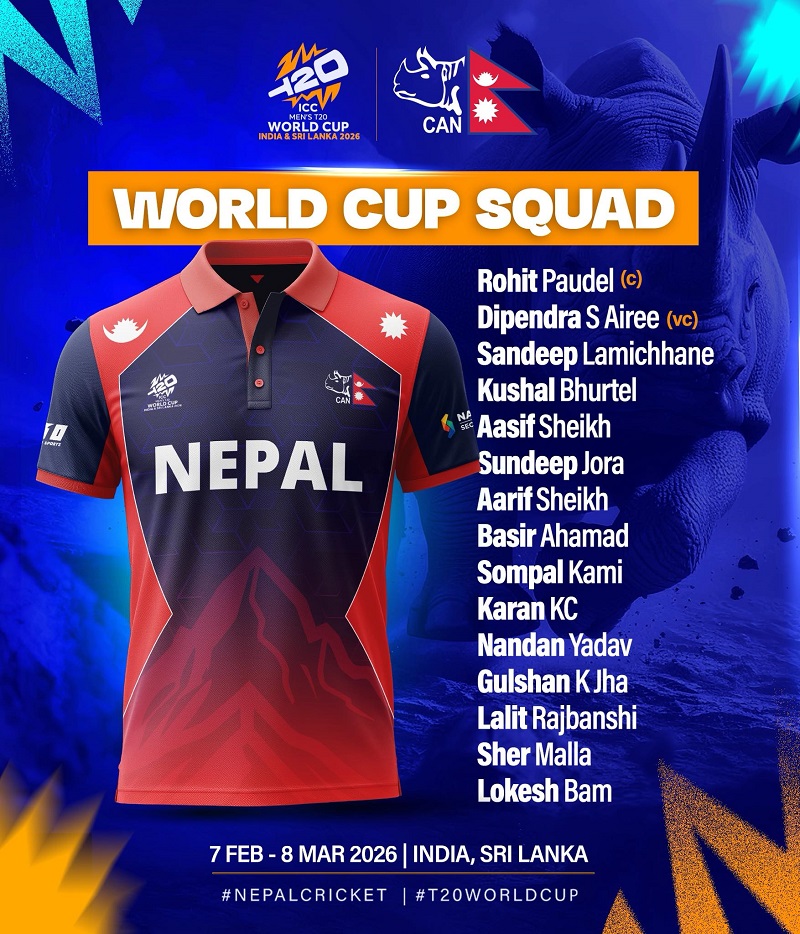 आउँदो फेब्रुअरी ७ तारिख (माघ २४) देखि फागुन २४ गतेसम्म भारत र श्रीलंकामा हुने आइसीसी पुरुष टी–२० विश्वकपका लागि नेपाली क्रिकेट टोलीको घोषणा गरिएको छ। नेपाल क्रिकेट संघ (क्यान) ले रोहितकुमार पौडेलको कप्तानीमा १५ सदस्यीय टोली सार्वजनिक गरेको हो।