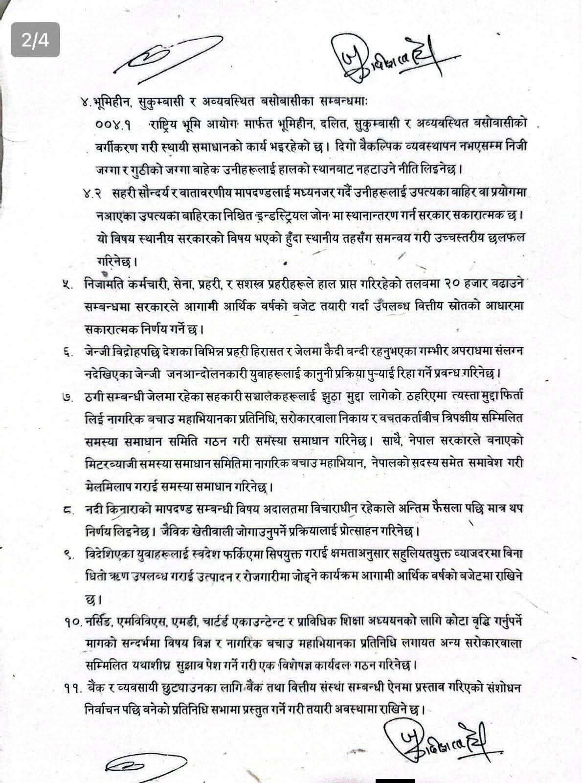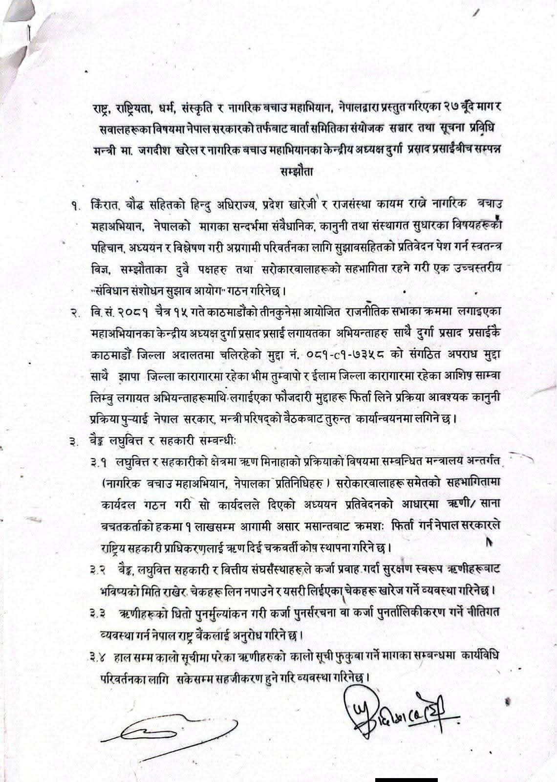 सिंहदरबारमा भएको वार्तापछि सञ्चार तथा सूचना प्रविधि मन्त्री जगदीश खरेल र महाअभियानका संयोजक दुर्गा प्रसाईँले सम्झौतामा हस्ताक्षर गरेका हुन्।