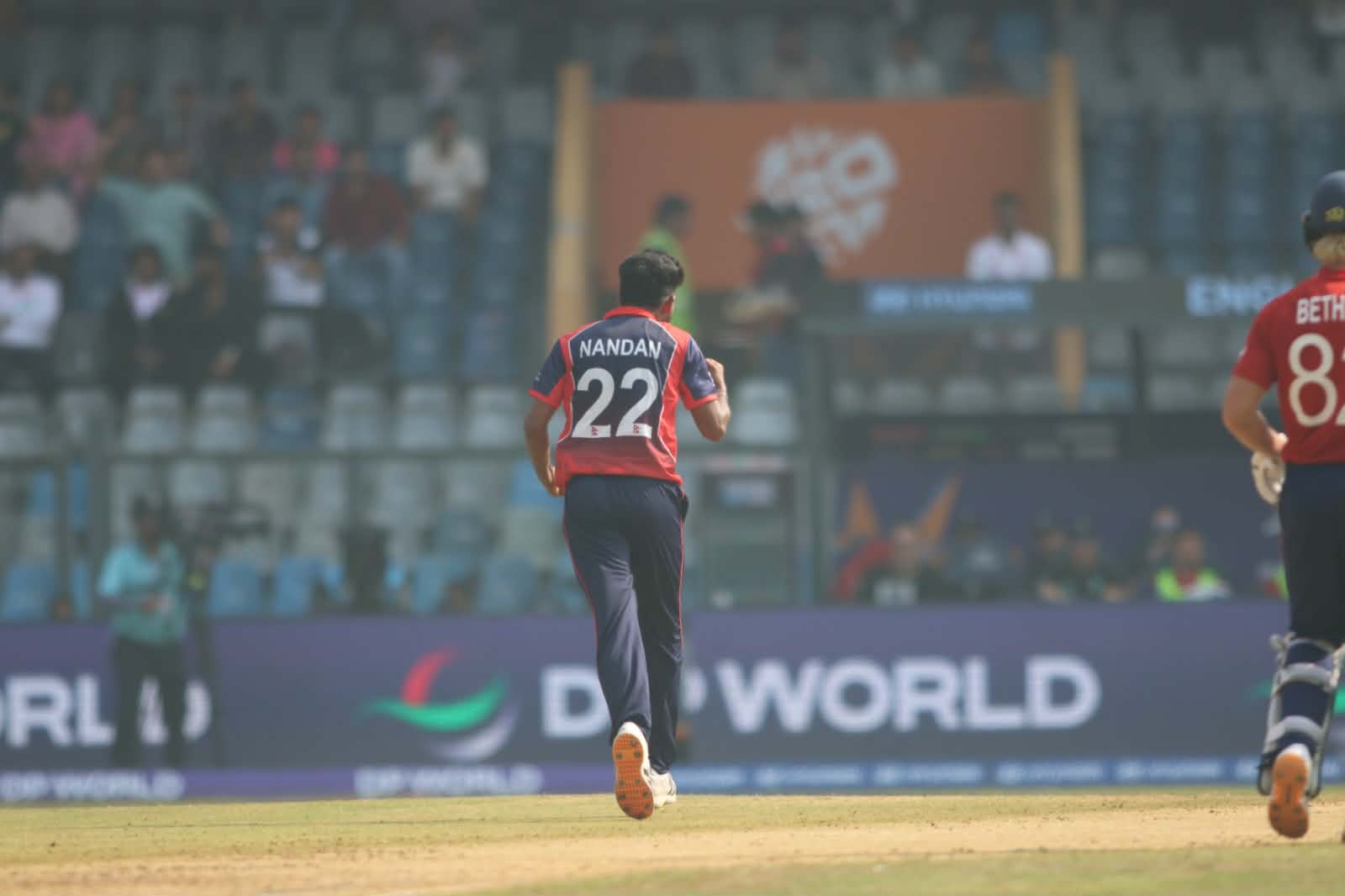 नेपालका दीपेन्द्रसिंह ऐरी र नन्दन यादवले दुई–दुई विकेट लिए भने सन्दीप लामिछाने र शेर मल्लले एक–एक विकेट लिए। यस खेलमा शेर मल्लसहित आरिफ शेख, लोकेश बम र नन्दन यादवले टी–२० विश्वकपमा डेब्यू गरेका छन्।
