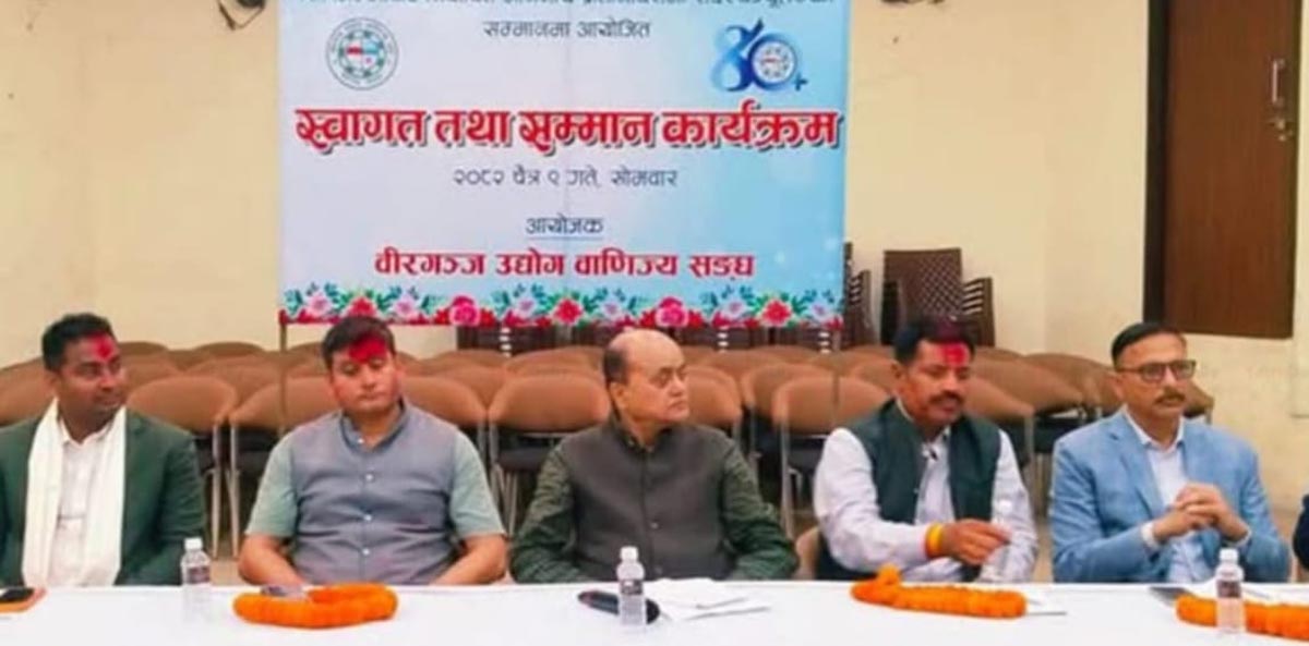 वीरगंज, ९ चैत । वीरगंज उद्योग वाणिज्य संघले पर्सा जिल्लाबाट नवनिर्वाचित चारजना प्रतिनिधिसभा सदस्यहरूलाई सोमवार एक कार्यक्रमको आयोजना गरी स्वागत तथा सम्मान गरेको छ ।