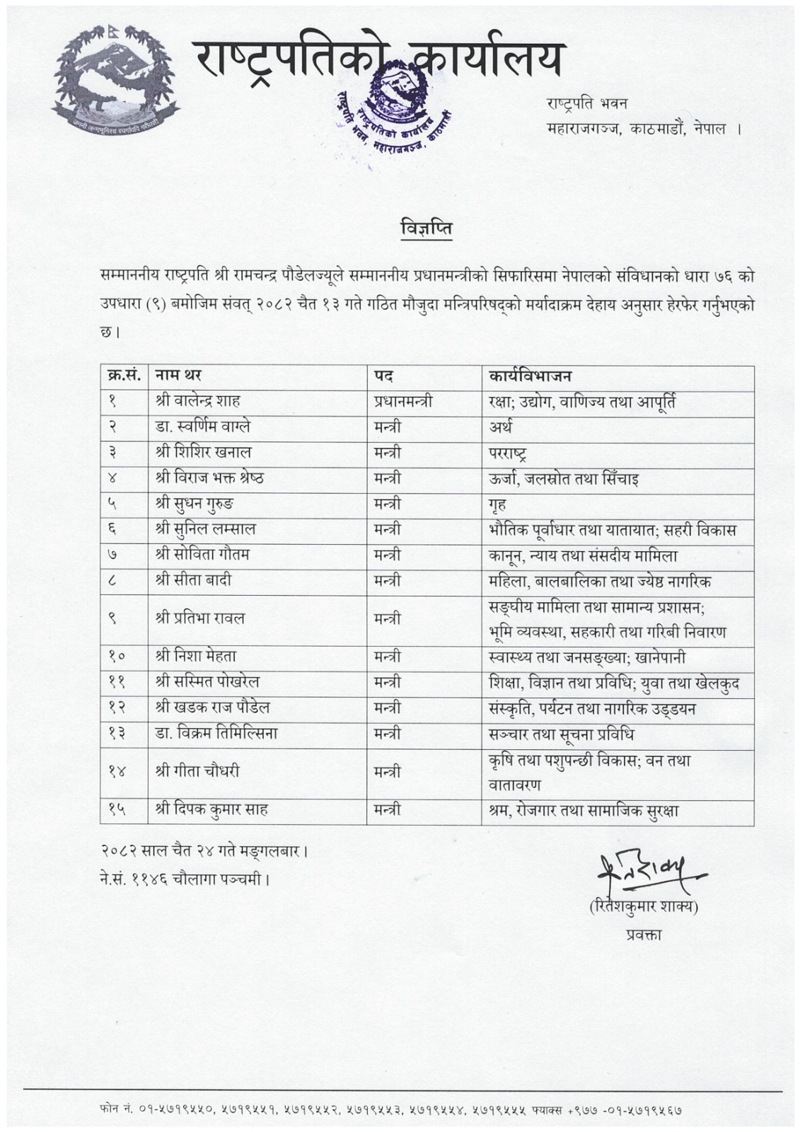 राष्ट्रपति रामचन्द्र पौडेलले मन्त्रीपरिषद्का सदस्यहरूको मर्यादाक्रम हेरफेर गरेका छन्। प्रधानमन्त्री बालेन्द्र शाहको सिफारिसमा संविधानको धारा ७६ को उपधारा (९) अनुसार नयाँ मर्यादाक्रम कायम गरिएको हो।
