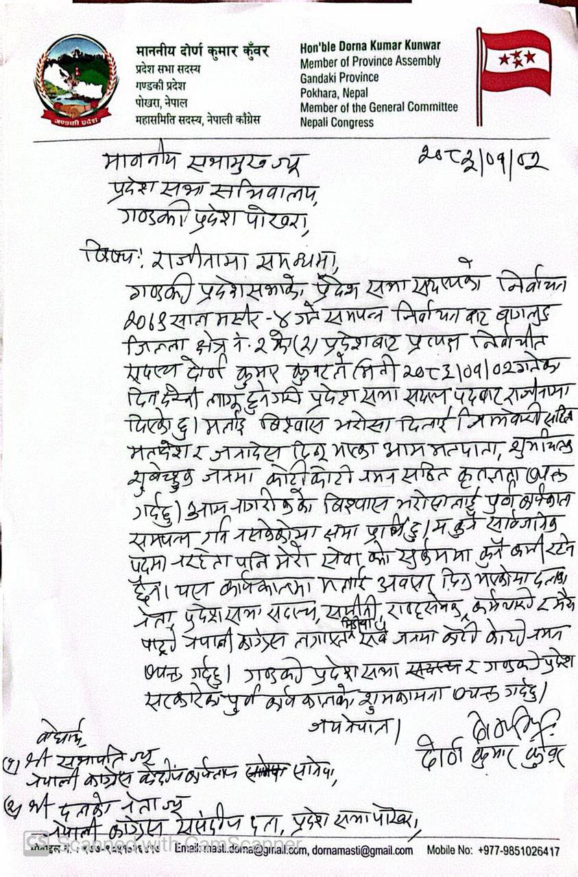 मन्त्री पद नपाएपछि गण्डकी प्रदेशका नेपाली कांग्रेसका प्रदेशसभा सदस्य द्रोर्णकुमार कुँवरले पदबाट राजीनामा दिएका छन्।