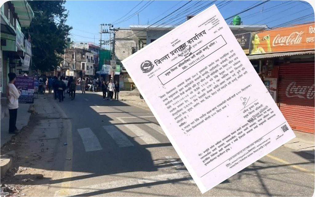 वीरगंज , मंसिर – ३ बारा जिल्लाको प्रशासनले सिमरा विमानस्थल आसपासको क्षेत्रमा अनिश्चितकालका लागि कर्फ्यु आदेश जारी गरेको छ। प्रमुख जिल्ला अधिकारी धमेन्द्र कुमार मिश्रले आज जारी गरेको आदेशमा स्थिति नियन्त्रणमा लिन यो कदम चालिएको उल्लेख गरिएको छ । प्रशासनले जनाएको छ कि, विमानस्थल क्षेत्रमा ‘जेन-जेड’ समूहका युवाहरूको प्रदर्शन र राजनीतिक दलसँग सम्बन्धित झडप, भिडभाड […]